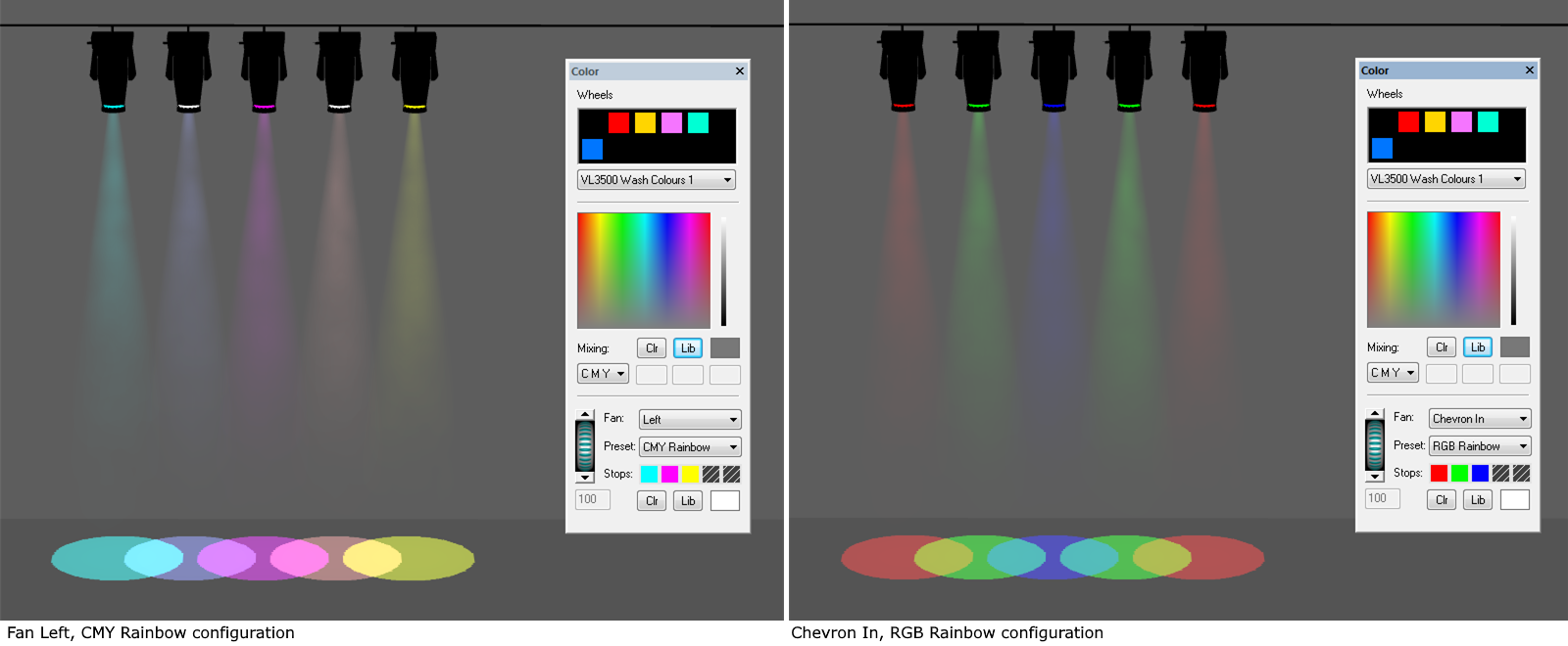 Color Fan offers predefined Color Presets with defined color stops, or custom color stops can be created (limit 5 color stops) using colors chosen from the color selector or gel library.