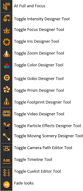 The design tools are individual toolbars that enable you to control certain parameters for selected fixtures. Currently these are the design tools: