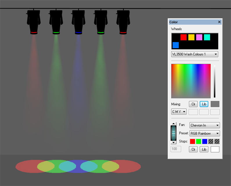 Color Fan offers predefined Color Presets with defined color stops, or custom color stops can be created (limit 5 color stops) using colors chosen from the color selector or gel library.