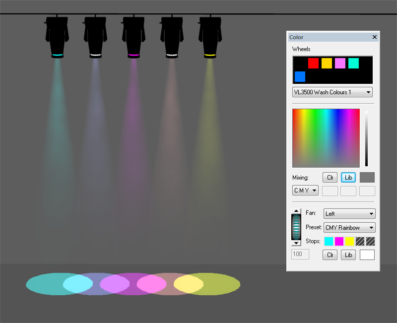 The same principle works if you select a color from the library by clicking the Library button. The wheel/scroller selection drop-down list is as discussed for the gobo wheel. All of the available colors are displayed in the order in which they appear on the wheel or scroll.