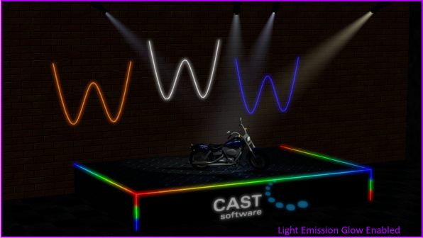 Creates a glow effect from objects for which Light Emission has been enabled to simulate light emitting from light boxes, projection screens, etc.